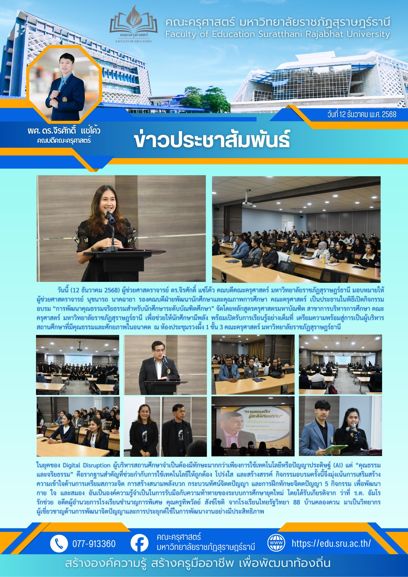 | คณะนิติศาสตร์ มหาวิทยาลัยราชภัฏสุราษฎร์ธานี เดินหน้าพัฒนาทักษะดิจิทัลนักศึกษา จัดโครงการพัฒนาสมรรถนะด้านเทคโนโลยี เตรียมความพร้อมสู่การทดสอบ สมรรถนะดิจิทัล (รุ่นที่ 2) | January 5, 2026 | คณะนิติศาสตร์ | SDG 4 | sdg-4 |