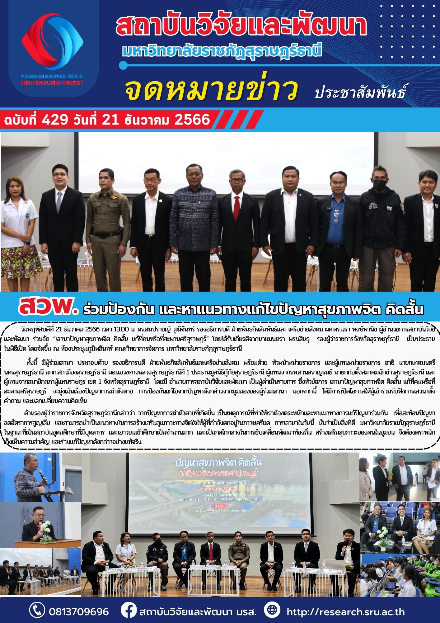 วันพฤหัสบดีที่ 21 ธันวาคม 2566 เวลา 13.00 น. ดร.สมปราชญ์ วุฒิจันทร์ รองอธิการบดี ฝ่ายพันธกิจสัมพันธ์และ เครือข่ายสังคม ผศ.ดร.นรา พงษ์พานิช ผู้อำนวยการสถาบันวิจัยและพัฒนา ร่วมจัด “เสวนาปัญหาสุขภาพจิต คิดสั้น แก้ที่คนหรือที่สะพานศรีสุราษฎร์” โดยได้รับเกียรติจากนายมนตรา พรมสินธุ รองผู้ว่าราชการจังหวัดสุราษฎร์ธานี เป็นประธาน ในพิธีเปิด โดยจัดขึ้น ณ ห้องประชุมภูมิพลินทร์ คณะวิทยาการจัดการ มหาวิทยาลัยราชภัฏสุราษฎร์ธานี