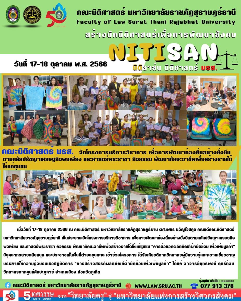 เมื่อวันที่ 17-18 ตุลาคม 2566 ณ คณะนิติศาสตร์ มหาวิทยาลัยราชภัฏสุราษฎร์ธาน ผศ.เพชร ขวัญใจสกุล คณบดีคณะนิติศาสตร์ มหาวิทยาลัยราชภัฏสุราษฎร์ธานี เป็นประธานเปิดโครงการบริการวิชาการ เพื่อการพัฒนาท้องถิ่นอย่างยั่งยืนตามหลักปรัชญาเศรษฐกิจพอเพียง และศาสตร์พระราชา กิจกรรม พัฒนาทักษะอาชีพเพื่อสร้างรายได้ให้แก่ชุมชน “การต่อยอดผลิตภัณฑ์ผ้ามัดย้อม เพื่อเพิ่มมูลค่า” มีบุคลากรสายสนับสนุน และประชาชนในพื้นที่ตำบลขุนทะเล เข้าร่วมโครงการ ได้รับเกียรติจากวิทยากรผู้มีความรู้และความเชี่ยวชาญบรรยายให้ความรู้อบรมเชิงปฏิบัติการ “การสร้างสรรค์ผลิตภัณฑ์ผ้ามัดย้อมเพื่อเพิ่มมูลค่า” ได้แก่ อาจารย์ฤทธิพงษ์ ฤทธิ์ท้วม วิทยากรจากศูนย์ศิลปะภูการ์ อำเภอเมือง จังหวัดภูเก็ต
