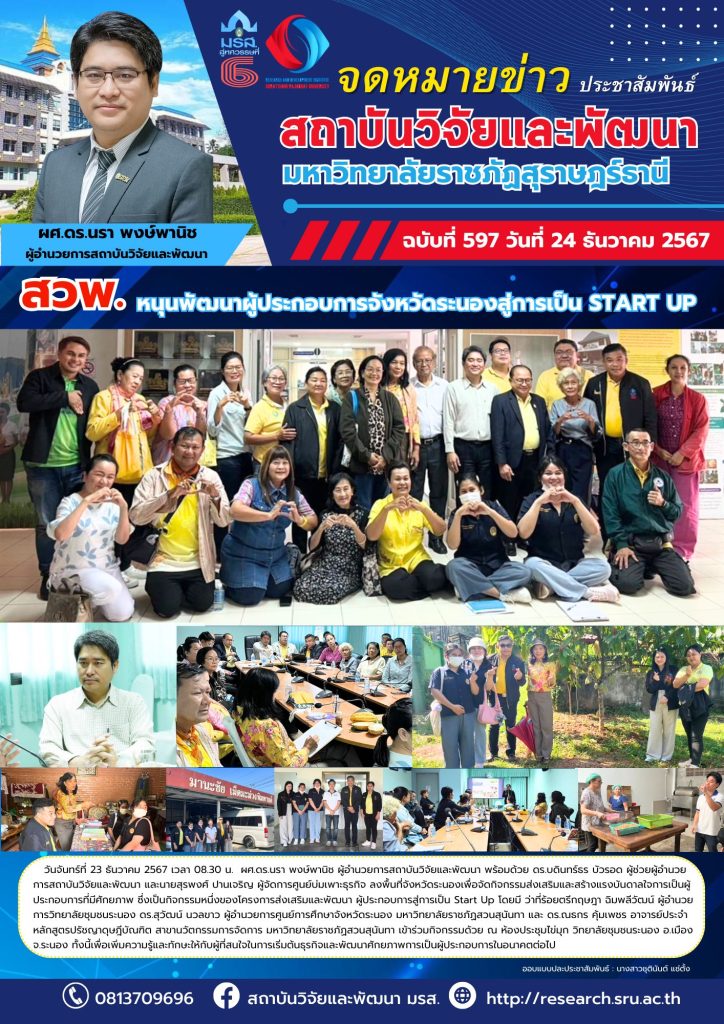 วันจันทร์ที่ 23 ธันวาคม 2567 เวลา 08.30 น. ผศ.ดร.นรา พงษ์พานิช ผู้อำนวยการสถาบันวิจัยและพัฒนา พร้อมด้วย ดร.บดินทร์ธร บัวรอด ผู้ช่วยผู้อำนวยการสถาบันวิจัยและพัฒนา และนายสุรพงศ์ ปานเจริญ ผู้จัดการศูนย์บ่มเพาะธุรกิจ ลงพื้นที่จังหวัดระนองเพื่อจัดกิจกรรมส่งเสริมและสร้างแรงบันดาลใจการเป็นผู้ประกอบการที่มีศักยภาพ ซึ่งเป็นกิจกรรมหนึ่งของโครงการส่งเสริมและพัฒนา ผู้ประกอบการสู่การเป็น Start Up โดยมี ว่าที่ร้อยตรีกฤษฎา ฉิมพลีวัฒน์ ผู้อำนวยการวิทยาลัยชุมชนระนอง ดร.สุวัฒน์ นวลขาว ผู้อำนวยการศูนย์การศึกษาจังหวัดระนอง มหาวิทยาลัยราชภัฏสวนสุนันทา และ ดร.ณธกร คุ้มเพชร อาจารย์ประจำหลักสูตรปรัชญาดุษฎีบัณฑิต สาขานวัตกรรมการจัดการ มหาวิทยาลัยราชภัฏสวนสุนันทา เข้าร่วมกิจกรรมด้วย ณ ห้องประชุมไข่มุก วิทยาลัยชุมชนระนอง อ.เมือง จ.ระนอง ทั้งนี้เพื่อเพิ่มความรู้และทักษะให้กับผู้ที่สนใจในการเริ่มต้นธุรกิจและพัฒนาศักยภาพการเป็นผู้ประกอบการในอนาคตต่อไป