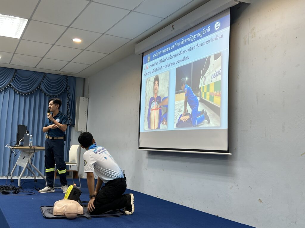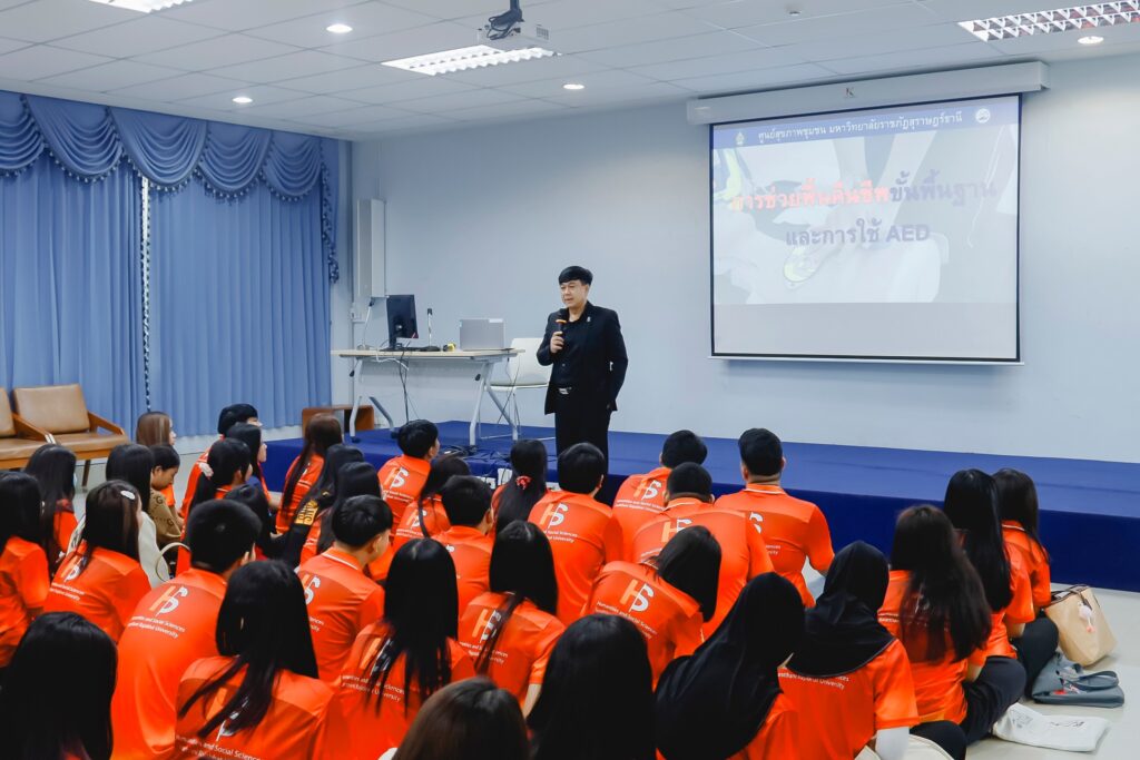 โครงการพัฒนาศักยภาพนักศึกษาคณะมนุษยศาสตร์และสังคมศาสตร์ กิจกรรมที่ 8.3 “อบรมเชิงปฏิบัติการการปฐมพยาบาลเบื้องต้น” จัดโดย สาขาวิชารัฐประศาสนศาสตร์ คณะมนุษยศาสตร์และสังคมศาสตร์ เมื่อวันที่ 25 สิงหาคม 2568 ณ ห้องประชุมลีลาวดี ชั้น 4 คณะมนุษยศาสตร์และสังคมศาสตร์ มหาวิทยาลัยราชภัฏสุราษฎร์ธานี โดยมีผู้ช่วยศาสตราจารย์ธาตรี คำแหง คณบดีคณะฯ เป็นประธานเปิดโครงการ กิจกรรมอบรมนี้ให้ความรู้และฝึกปฏิบัติด้านการปฐมพยาบาล ทั้งการดามกระดูก การห้ามเลือด การช่วยสิ่งแปลกปลอมติดคอ และการช่วยฟื้นคืนชีพ (CPR) ซึ่งนักศึกษาได้เรียนรู้เทคนิคและแนวทางปฏิบัติจริงจากวิทยากรผู้เชี่ยวชาญ