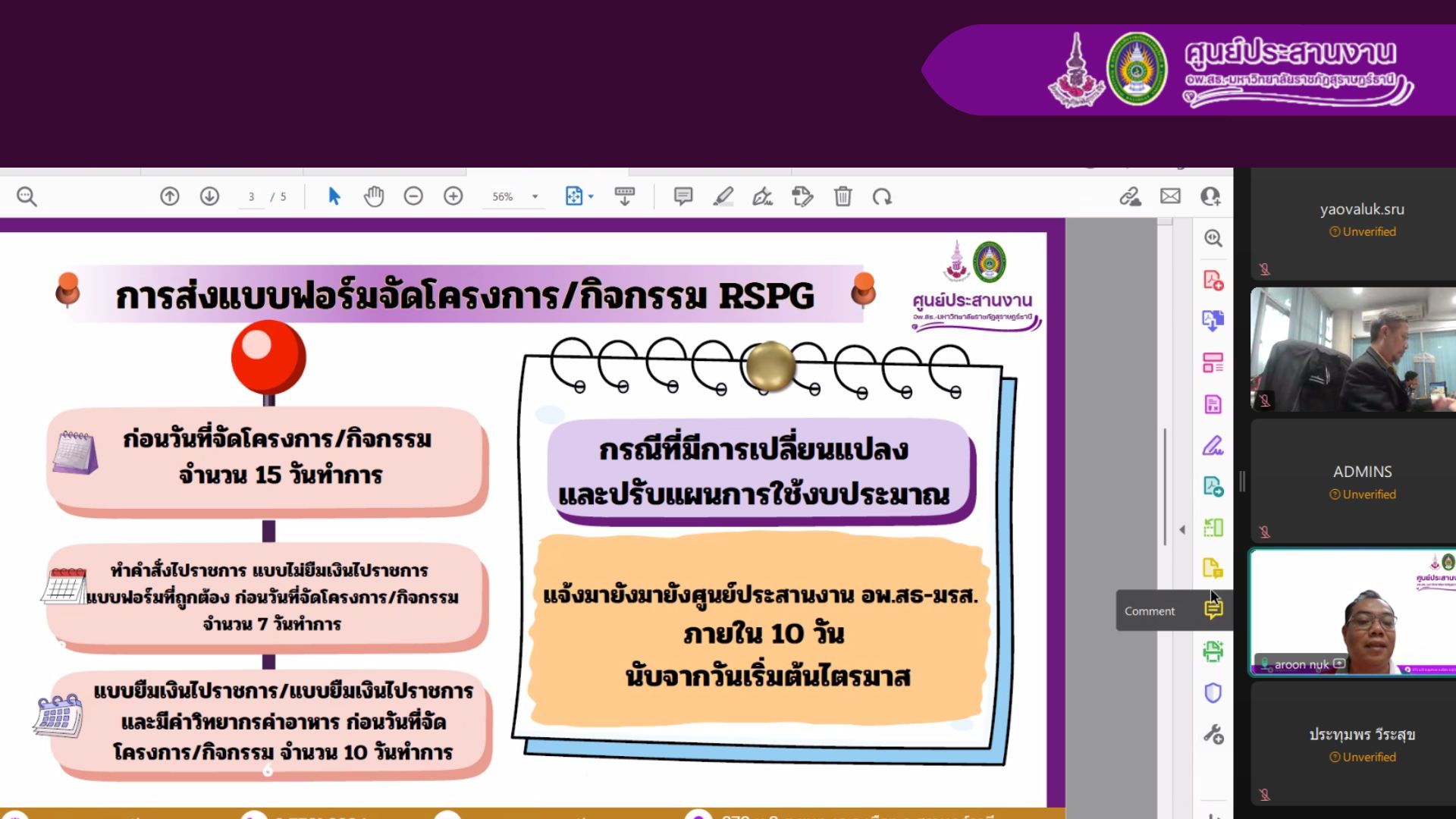 นายอรุณ หนูขาว หัวหน้าสำนักงานศูนย์ประสานงาน อพ.สธ.-มรส.ได้ชี้แจงเรื่องกรอบแนวทางการดำเนินงานโครงการ ประจำปีงบประมาณ พ.ศ. 2569 เช่น แผนการใช้จ่ายงบประมาณรายจ่าย ประจำปีงบประมาณ พ.ศ. 2569 การจัดทำเอกสารตามแบบฟอร์ม RSPG หลักเกณฑ์การเบิกจ่ายงบประมาณที่ถูกต้องและเป็นไปตามระเบียบ พร้อมทั้งเน้นย้ำให้ผู้รับผิดชอบโครงการพิจารณารายละเอียดการดำเนินโครงการ/กิจกรรมตามแผนให้ครบถ้วน เพื่อให้ผู้รับผิดชอบโครงการสามารถขับเคลื่อนการดำเนินงานร่วมกันได้อย่างมีทิศทางและเกิดผลสัมฤทธิ์สูงสุด นอกจากนี้ ยังได้ชี้แจงขั้นตอนการตรวจรับวัสดุ/อุปกรณ์ การเก็บรักษาอย่างเหมาะสม ตลอดจนแนวทางการรายงานผลการดำเนินโครงการตามแบบฟอร์มของกองนโยบายและแผน เพื่อให้ทุกขั้นตอนเป็นไปอย่างมีประสิทธิภาพและสอดคล้องกับเป้าหมายของมหาวิทยาลัย
