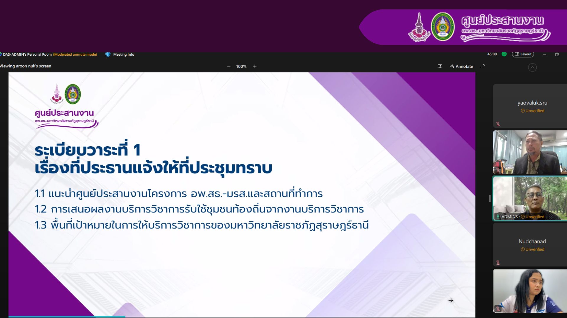 วันที่ 17 ตุลาคม 2568 (15.00 น.)ผู้ช่วยศาสตราจารย์ ดร.วัฒนา รัตนพรหม อธิการบดีมหาวิทยาลัยราชภัฏสุราษฎร์ธานี มอบหมายให้ ผู้ช่วยศาสตราจารย์ ดร.เสน่ห์ บุญกำเนิด รองอธิการบดี ปฏิบัติหน้าที่ ผู้อำนวยการศูนย์ประสานงาน อพ.สธ.-มหาวิทยาลัยราชภัฏสุราษฎร์ธานี เป็นประธานการประชุมชี้แจงแนวทางการดำเนินงานโครงการอนุรักษ์พันธุกรรมพืชอันเนื่องมาจากพระราชดำริฯ มหาวิทยาลัยราชภัฏสุราษฎร์ธานี (อพ.สธ.-มรส.) โครงการส่งเสริมคุณภาพการศึกษาโรงเรียนตำรวจตระเวนชายแดน และงานโครงการยุทธศาสตร์ราชภัฏด้านการพัฒนาท้องถิ่น ประจำปีงบประมาณ พ.ศ. 2569 ผ่านระบบออนไลน์ (Webex) โดยมีอาจารย์ผู้ดำเนินโครงการ เจ้าหน้าที่ ผู้รับผิดชอบโครงการ และผู้ประสานงานฯ เข้าร่วมประชุม