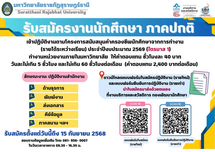 #SRU#มหาวิทยาลัยราชภัฏสุราษฎร์ธานี#งานพิเศษนักศึกษา#รายได้ระหว่างเรียน