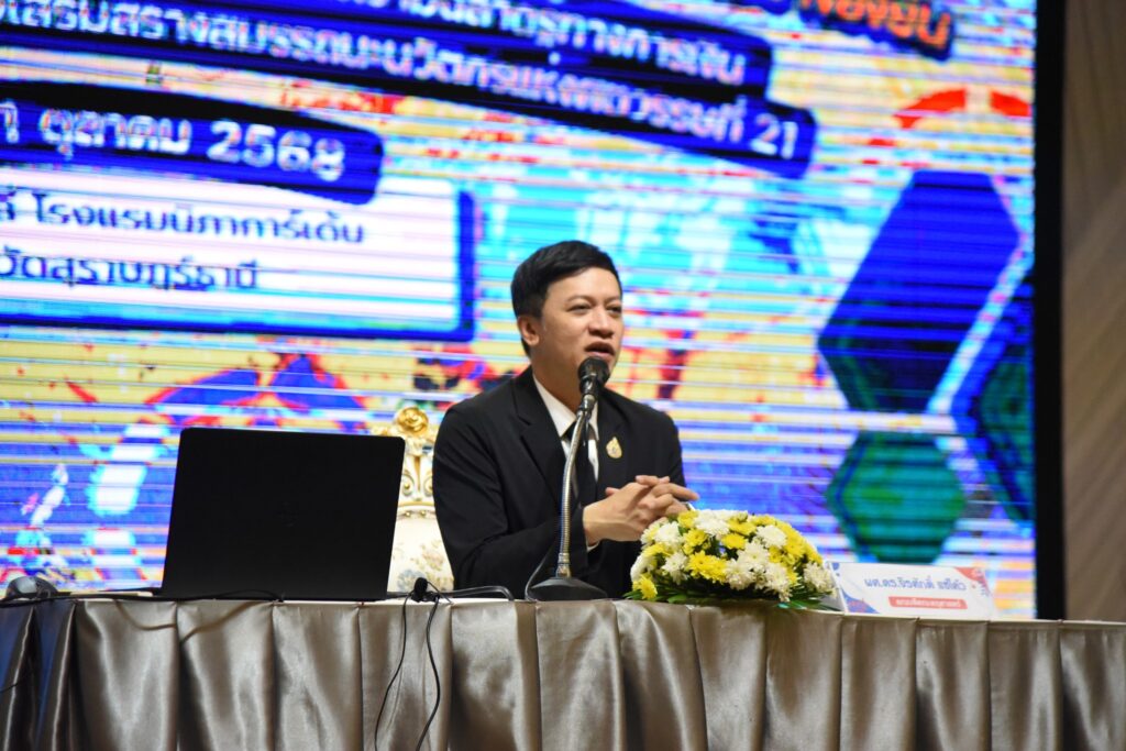 (31 ตุลาคม 2568) ผศ. ดร.จิรศักดิ์ แซ่โค้ว คณบดีคณะครุศาสตร์ มหาวิทยาลัยราชภัฏสุราษฎร์ธานี เป็นประธานในพิธีเปิดกิจกรรมการอบรมเชิงปฏิบัติการการบูรณาการความฉลาดรู้ทางการเงิน (Financial Literacy) เพื่อเสริมสร้างสมรรถนะนวัตกรแห่งศตวรรษที่ 21 ภายใต้โครงการเสริมสร้างทักษะนวัตกรทางการศึกษาเพื่อการพัฒนาเชิงพื้นที่อย่างยั่งยืน ณ ห้องลิลลี่ โรงแรมนิภาการ์เด้น จังหวัดสุราษฎร์ธานี เพื่อพัฒนาความสามารถในการวางแผนจัดการและตัดสินใจทางการเงินอย่างมีประสิทธิภาพและมีความรับผิดชอบส่งเสริมให้ผู้เข้าร่วมอบรมสามารถ บูรณาการความรู้ทางการเงิน เข้ากับการเรียนการสอน การทำงาน และการดำรงชีวิตประจำวัน พัฒนาสมรรถนะที่สำคัญของ นวัตกรแห่งศตวรรษที่ 21 ได้แก่ การคิดวิเคราะห์ การแก้ปัญหา ความคิดสร้างสรรค์ และการใช้เทคโนโลยีดิจิทัลอย่างรู้เท่าทัน