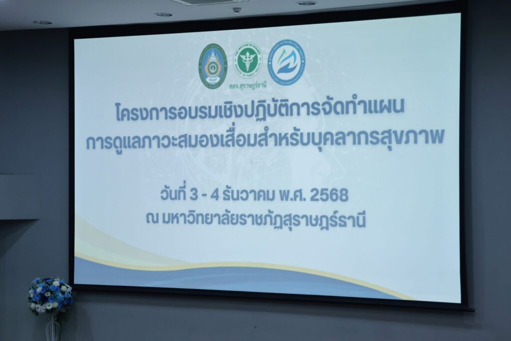 ศูนย์สุขภาพชุมชน มหาวิทยาลัยราชภัฏสุราษฎร์ธานี (มรส.) ร่วมกับสำนักงานสาธารณสุขจังหวัดสุราษฎร์ธานี จัดโครงการอบรมเชิงปฏิบัติการ “การจัดทำแผนการดูแลภาวะสมองเสื่อมสำหรับบุคลากรสุขภาพ จังหวัดสุราษฎร์ธานี ประจำปีงบประมาณ 2569” มุ่งพัฒนาศักยภาพบุคลากรสุขภาพให้สามารถดูแลผู้ป่วยภาวะสมองเสื่อมได้อย่างถูกต้อง เป็นระบบ และเป็นมาตรฐานเดียวกันทั้งจังหวัด เพื่อรองรับสังคมผู้สูงอายุที่กำลังเติบโตอย่างรวดเร็วในพื้นที่สุราษฎร์ธานี