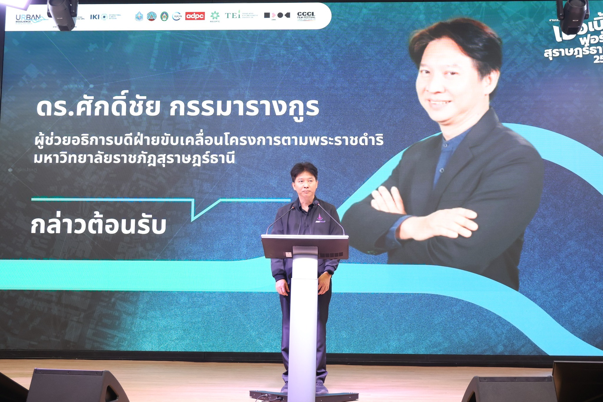 เมื่อวันที่ 12 ธันวาคม 2568 ผศ.ดร.วัฒนา รัตนพรหม อธิการบดีมหาวิทยาลัยราชภัฏสุราษฎร์ธานี มอบหมายให้ ดร.ศักดิ์ชัย กรรมารางกูร ผู้ช่วยอธิการบดีฝ่ายขับเคลื่อนโครงการตามพระราชดำริ เป็นตัวแทนกล่าวต้อนรับ พร้อมเข้าร่วมกิจกรรมการเสวนาระดับจังหวัดโครงการเสริมสร้างความสามารถของเมืองและธรรมชาติในการตั้งรับและปรับตัวต่อผลกระทบจากวิกฤตสภาพภูมิอากาศ (Urban Resilience Provincial Forum 2025) ณ ห้องประชุมออดิทอเรียม อาคารทีปังกรรัศมีโชติ มหาวิทยาลัยราชภัฏสุราษฎร์ธานี โดยมีนายกล้าณรงค์ ยุติธรรม รองผู้ว่าราชการจังหวัดสุราษฎร์ธานี เป็นประธานในพิธี โดยมีหัวหน้าส่วนราชการ ผู้แทนภาครัฐ ภาคเอกชน คณะผู้บริหาร อาจารย์ และนักศึกษา เข้าร่วมกิจกรรมจำนวนมาก นอกจากนี้ ยังมีองค์การระหว่างประเทศเพื่อการอนุรักษ์ธรรมชาติ (IUCN) พร้อมด้วย 4 องค์กรภาคี เป็นผู้จัดงาน ประกอบด้วย ศูนย์เตรียมความพร้อมรับมือภัยพิบัติแห่งเอเชีย (ADPC) ศูนย์วนศาสตร์ชุมชนเพื่อคนกับป่า (RECOFTC) สถาบันสิ่งแวดล้อมไทย (TEI) และศูนย์ออกแบบและพัฒนาเมือง (UDDC)