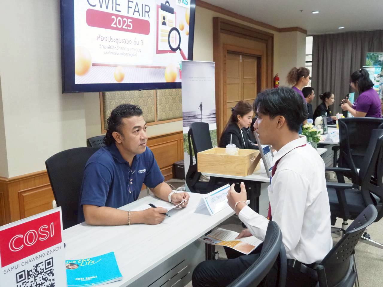 วิทยาลัยสหวิทยาการ เกาะสมุย จัดกิจกรรม CWIE FAIR 2025 เพื่อส่งเสริมการจัดการเรียนรู้ตามแนวทางการศึกษาเชิงบูรณาการกับการทำงาน (Cooperative and Work Integrated Education : CWIE) เปิดโอกาสให้นักศึกษาได้พบปะและสมัครเข้าฝึกประสบการณ์วิชาชีพกับสถานประกอบการโดยตรง