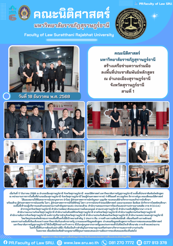 เมื่อวันที่ 17 ธันวาคม 2568 ณ อำเภอเมืองสุราษฎร์ธานี จังหวัดสุราษฎร์ธานี คณะนิติศาสตร์ มหาวิทยาลัยราชภัฏสุราษฎร์ธานี ลงพื้นที่ประชาสัมพันธ์หลักสูตร ณ หน่วยงานราชการในพื้นที่อำเภอเมืองสุราษฎร์ธานี จังหวัดสุราษฎร์ธานี