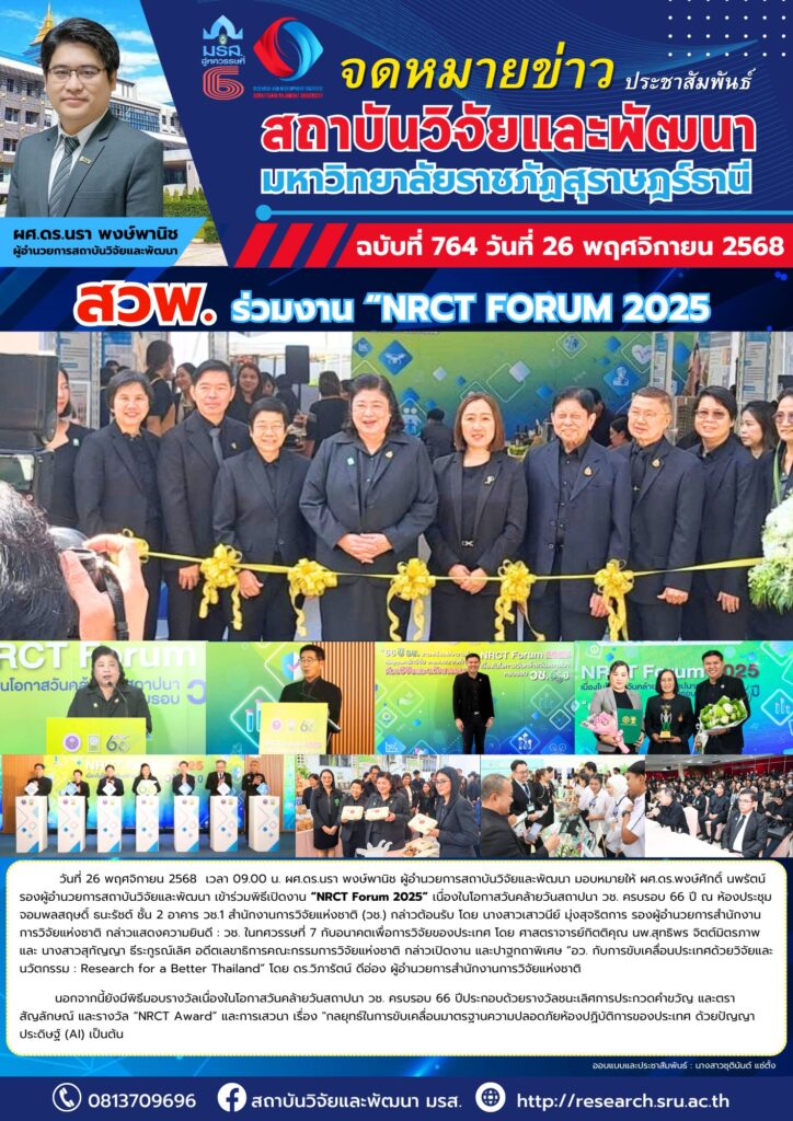 วันที่ 26 พฤศจิกายน 2568 เวลา 09.00 น. ผศ.ดร.นรา พงษ์พานิช ผู้อำนวยการสถาบันวิจัยและพัฒนา มอบหมายให้ ผศ.ดร.พงษ์ศักดิ์ นพรัตน์ รองผู้อำนวยการสถาบันวิจัยและพัฒนา เข้าร่วมพิธีเปิดงาน “NRCT Forum 2025” เนื่องในโอกาสวันคล้ายวันสถาปนา วช. ครบรอบ 66 ปี ณ ห้องประชุมจอมพลสฤษดิ์ ธนะรัชต์ ชั้น 2 อาคาร วช.1 สำนักงานการวิจัยแห่งชาติ (วช.) กล่าวต้อนรับ โดย นางสาวเสาวนีย์ มุ่งสุจริตการ รองผู้อำนวยการสำนักงานการวิจัยแห่งชาติ กล่าวแสดงความยินดี : วช. ในทศวรรษที่ 7 กับอนาคตเพื่อการวิจัยของประเทศ โดย ศาสตราจารย์กิตติคุณ นพ.สุทธิพร จิตต์มิตรภาพและ นางสาวสุกัญญา ธีระกูรณ์เลิศ อดีตเลขาธิการคณะกรรมการวิจัยแห่งชาติ กล่าวเปิดงาน และปาฐกถาพิเศษ “อว. กับการขับเคลื่อนประเทศด้วยวิจัยและนวัตกรรม : Research for a Better Thailand” โดย ดร.วิภารัตน์ ดีอ่อง ผู้อำนวยการสำนักงานการวิจัยแห่งชาติ