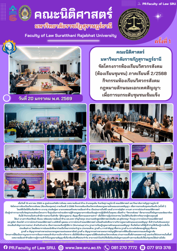 คณะนิติศาสตร์ มหาวิทยาลัยราชภัฏสุราษฎร์ธานี กำหนดจัดโครงการห้องเรียนวิศวกรสังคม (ห้องเรียนชุมชน) ภาคเรียนที่ 2/2568 กิจกรรมห้องเรียนวิศวกรสังคมกฎหมายลักษณะเอกเทศสัญญา:เพื่อการยกระดับชุมชนเข้มแข็ง ในวันที่ 19, 20 มกราคม 2569 ณ ศูนย์กองสวัสดิการสังคม เทศบาลเมืองท่าข้ามอำเภอพุนพิน จังหวัดสุราษฎร์ธานี และในวันที่ 26, 27 มกราคม 2569 ณ ห้องโสตทัศนศึกษา โรงเรียนพุนพินพิทยาคม อำเภอพุนพิน จังหวัดสุราษฎร์ธานี มีวัตถุประสงค์เพื่อนำองค์ความรู้ทางวิชาการไปสู่การใช้ประโยชน์ในการพัฒนาชุมชนท้องถิ่น ยกระดับคุณภาพการศึกษาและยกระดับชุมชนเข้มแข็ง มุ่งสู่การพัฒนาที่ยั่งยืน