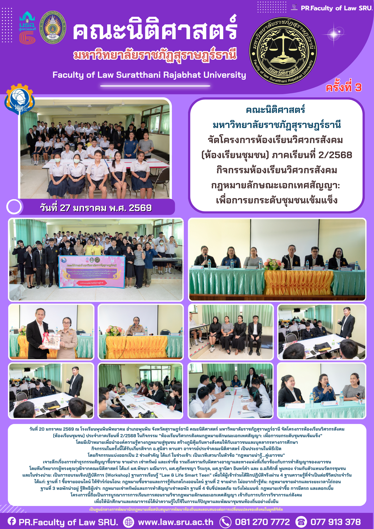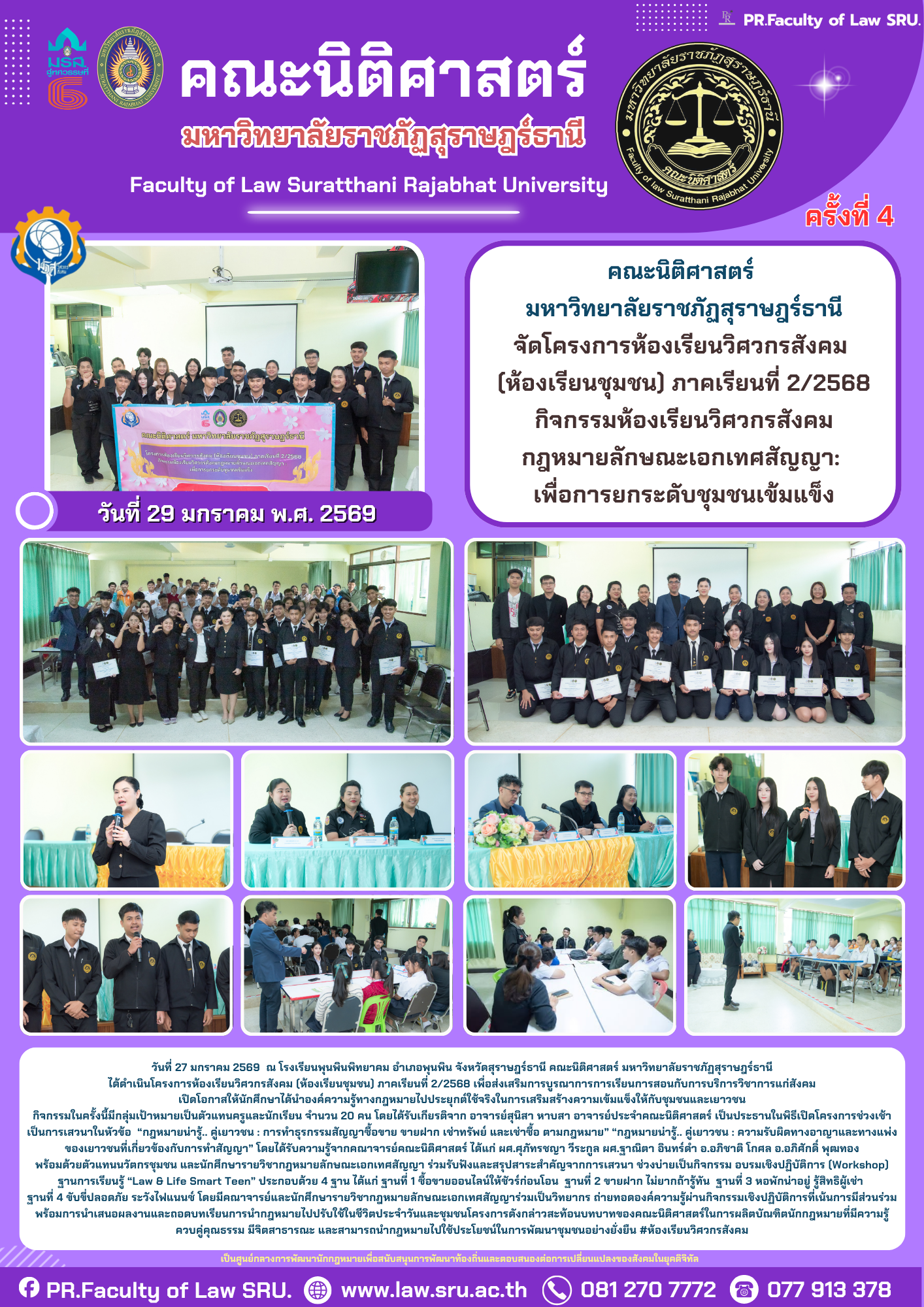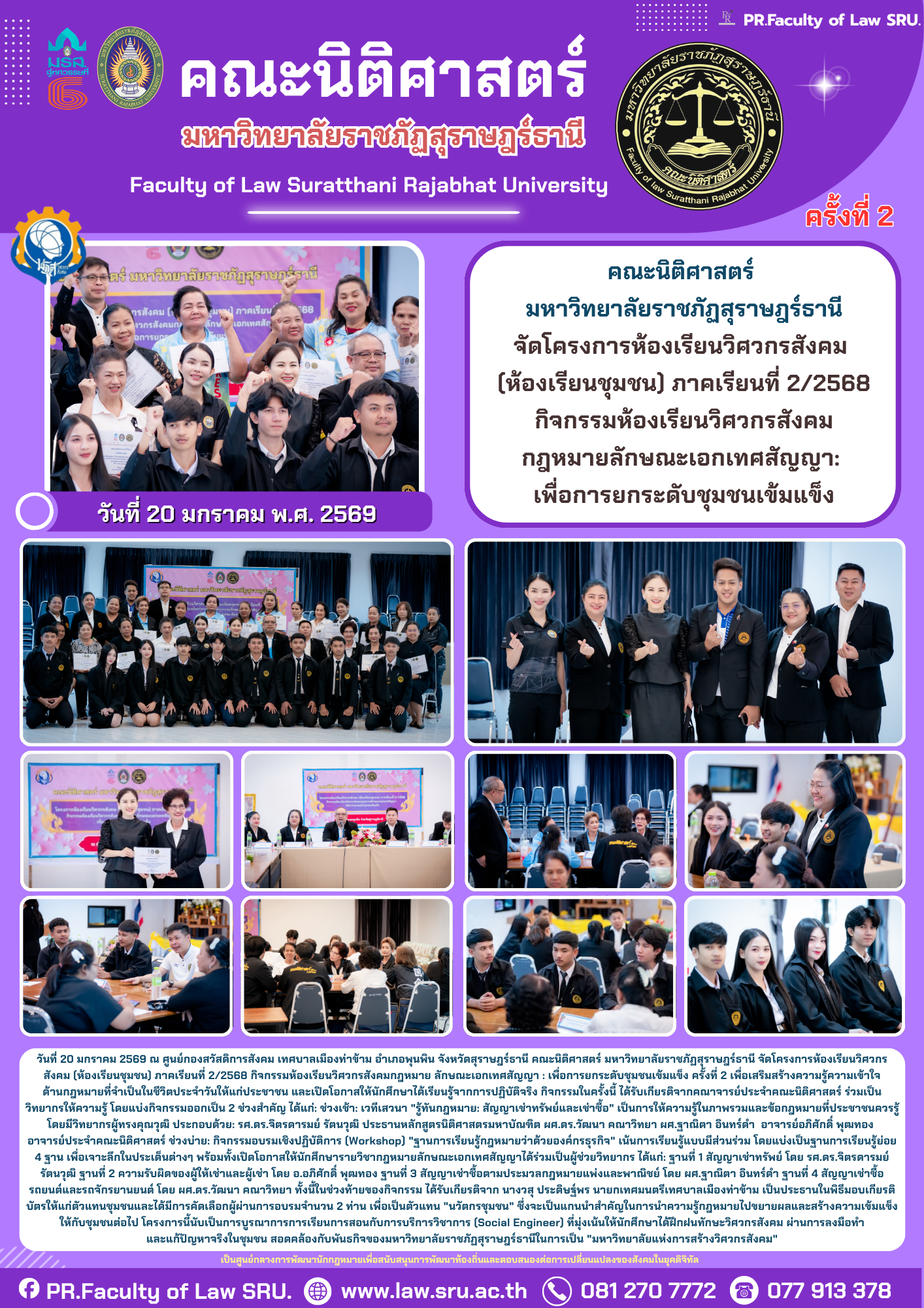 คณะนิติศาสตร์ มหาวิทยาลัยราชภัฏสุราษฎร์ธานี กำหนดจัดโครงการห้องเรียนวิศวกรสังคม (ห้องเรียนชุมชน) ภาคเรียนที่ 2/2568 กิจกรรมห้องเรียนวิศวกรสังคมกฎหมายลักษณะเอกเทศสัญญา:เพื่อการยกระดับชุมชนเข้มแข็ง ในวันที่ 19, 20 มกราคม 2569 ณ ศูนย์กองสวัสดิการสังคม เทศบาลเมืองท่าข้ามอำเภอพุนพิน จังหวัดสุราษฎร์ธานี และในวันที่ 26, 27 มกราคม 2569 ณ ห้องโสตทัศนศึกษา โรงเรียนพุนพินพิทยาคม อำเภอพุนพิน จังหวัดสุราษฎร์ธานี มีวัตถุประสงค์เพื่อนำองค์ความรู้ทางวิชาการไปสู่การใช้ประโยชน์ในการพัฒนาชุมชนท้องถิ่น ยกระดับคุณภาพการศึกษาและยกระดับชุมชนเข้มแข็ง มุ่งสู่การพัฒนาที่ยั่งยืน