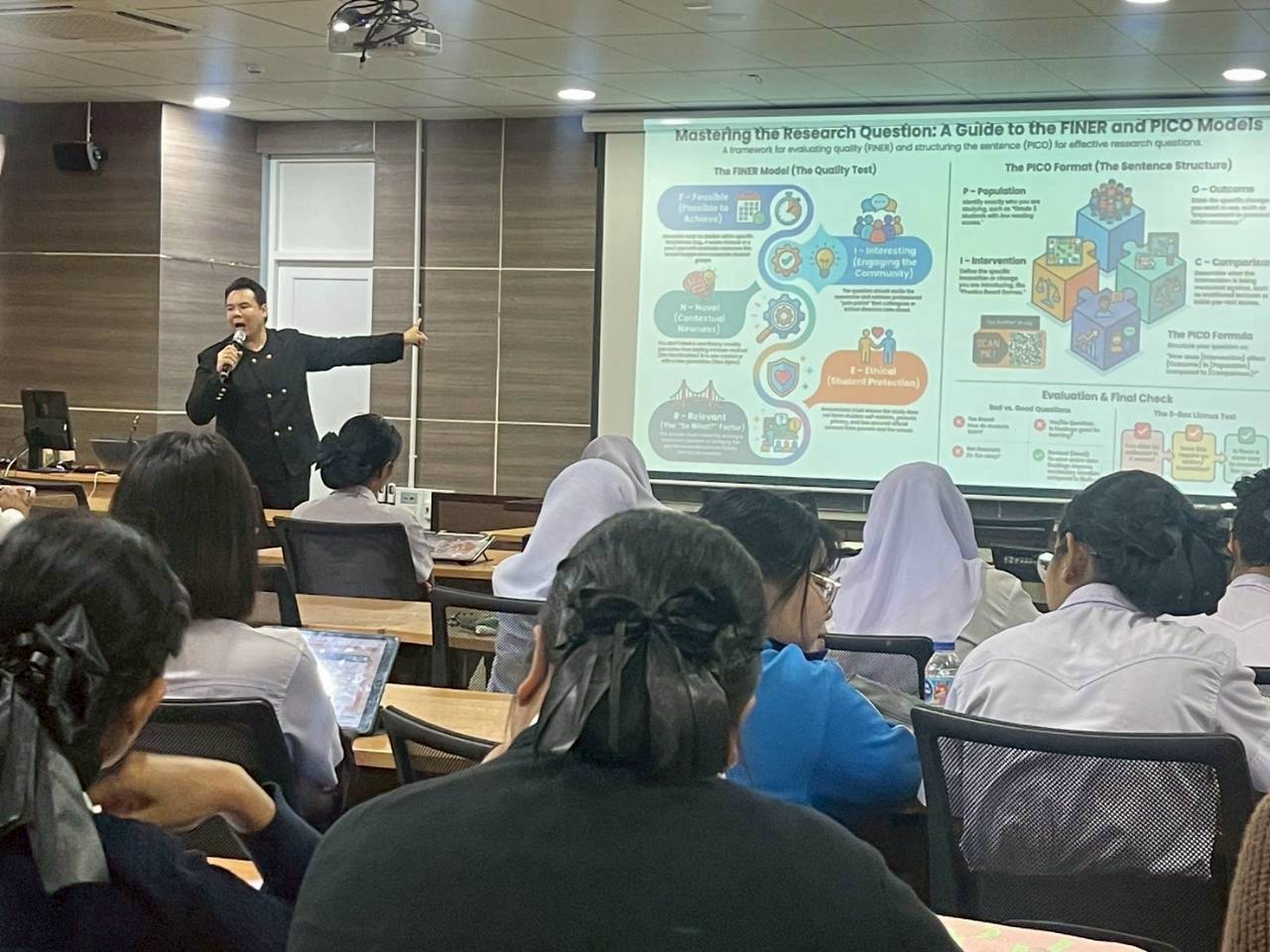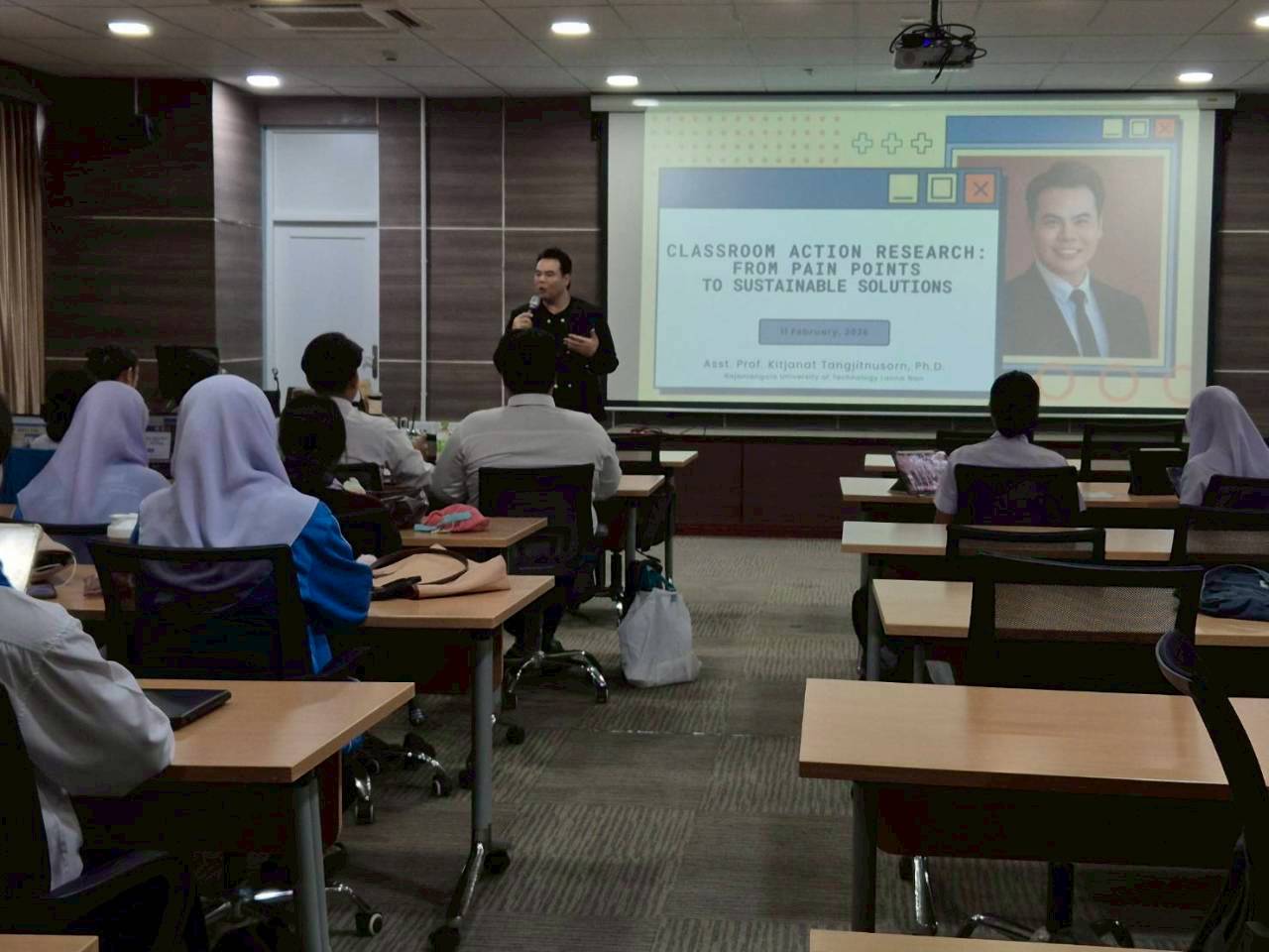 โครงการนี้มุ่งพัฒนาศักยภาพการวิจัยของนักศึกษาครูภาษาอังกฤษ เพื่อให้สามารถนำกระบวนการวิจัยไปแก้ปัญหาและพัฒนาการจัดการเรียนรู้ภาษาอังกฤษในชั้นเรียนได้จริง โดยได้รับเกียรติจาก ผศ.ดร.กิจจาณัฏฐ์ ตั้งจิตนุสรณ์ หัวหน้าสาขาศิลปศาสตร์และอาจารย์ประจำหลักสูตรภาษาอังกฤษเพื่อการสื่อสารสากล คณะบริหารธุรกิจและศิลปศาสตร์ มหาวิทยาลัยเทคโนโลยีราชมงคลล้านนา น่าน ซึ่งมีผลงานวิจัยเผยแพร่เป็นที่ยอมรับอย่างกว้างขวาง มาเป็นวิทยากรตลอดวัน
